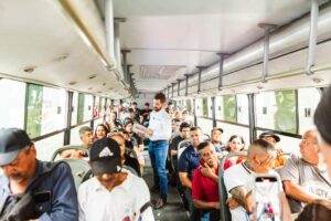 Tras veinticinco minutos de espera en la parada del camión, el candidato pudo conversar con las y los usuarios del mismo, en donde notó una gran desaprobación en el tema de movilidad, ya que la mayoría ellos dedican más de tres horas al día para trasladarse.