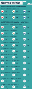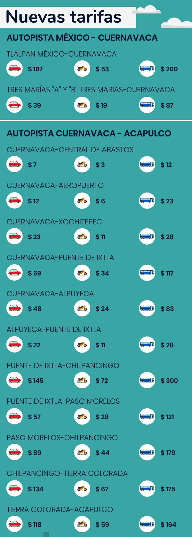 En el tramo de la Cuernavaca-Acapulco las nuevas tarifas tienen un costo total de 466 pesos para autos. Antes costaba 432 pesos.