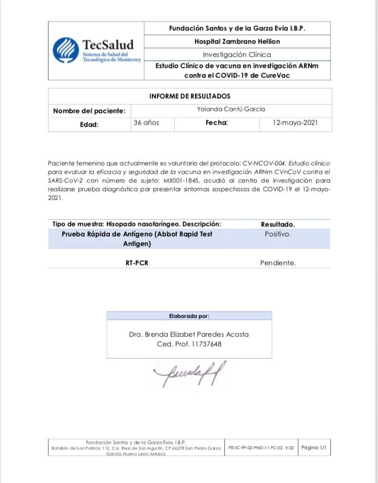 En este proceso Cantú García se sometió el pasado 03 de abril a una primera dosis de la que actualmente desconoce sí se le aplicó la vacuna o un placebo y una segunda dosis el día 08 del presente mes de mayo, como parte del protocolo del TEC.