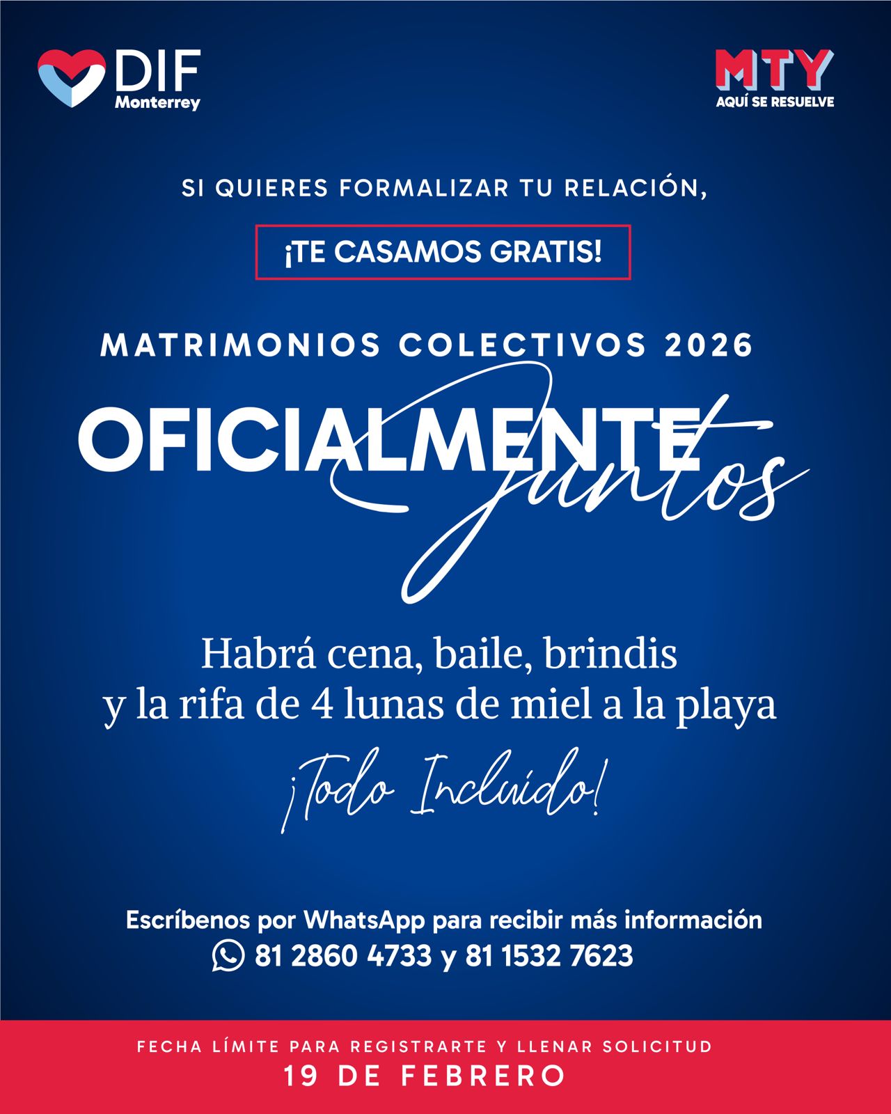 El DIF Monterrey invitó a las parejas a participar en los matrimonios colectivos gratuitos del programa “Oficialmente Juntos”, que se realizarán en el marco del Día del Amor y la Amistad.