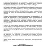 La Federación de Cronistas exigió a las autoridades esclarecer lo ocurrido y a través de un comunicado, pidieron la destitución del personal de prensa de Cruz Azul: «Exigimos con toda firmeza la destitución inmediata de los responsables del área de Prensa y Comunicación Institucional del Club Cruz Azul, así como la intervención de las autoridades competentes para esclarecer los hechos y sancionar con todo el rigor de la ley a quienes resulten responsables de estos actos (…). Se procederá por reglamento’»; advirtieron.