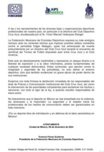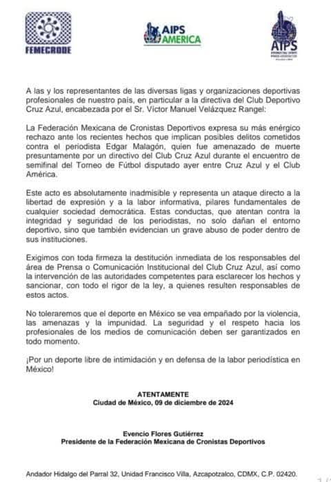 Mediante un comunicado, la Femecrode indicó que lo ocurrido es un ataque directo a la Libertad de Expresión y destacó que los lamentables acontecimientos ponen en evidencia el grave abuso de poder perpetrado en el interior de la institución celeste contra un representante de prensa; por lo que el organismo subrayó su más enérgico rechazo ante los hechos cometidos durante el encuentro Semifinal del torneo de futbol disputado entre Cruz Azul y el Club América.