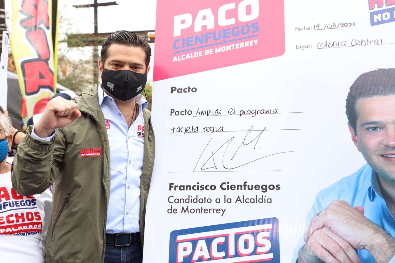 Con el objetivo de mejorar el bienestar de las mujeres en situación vulnerable y contribuir a la economía familiar, el candidato de la coalición PRI-PRD: «Va Fuerte por Nuevo León», a la alcaldía de Monterrey, Paco Cienfuegos, pactó ampliar el número de apoyos del programa “Tarjeta Regia” para favorecer a 20 mil mujeres más y llegar así a un total de 60 mil beneficiarias.