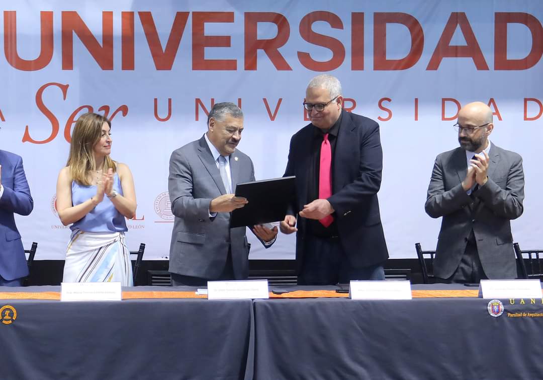 La ceremonia la encabezó el Rector de la UANL, Santos Guzmán López, quien estuvo acompañado de la directora de la Facultad de Arquitectura (FARQ), María Teresa Cedillo Salazar, y el presidente del organismo acreditador, Luis Antonio Rivera Díaz.