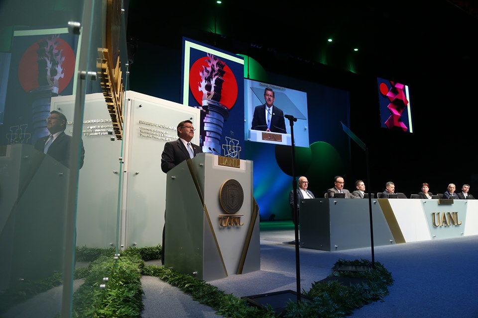 Jueves 12 de Septiembre, 2019. 8:00 p. m. (Mary Tovar).- Ante los desafíos de la transformación nacional y las megatendencias mundiales, la historia de los 86 años de vida Académica de la Universidad Autónoma de Nuevo León, inspira a sus graduados a seguir en la evolución, como una extensión de lo que en la Máxima Casa de Estudios aprendieron, al recibir educación integral de calidad, plural, incluyente, equitativa, de talla internacional, con lo que los egresados se fortalecen para seguir en constante proceso de transformación, enfrentando desafíos y venciéndolos, como una prueba de que lo que bien se aprende no se olvida. El Rector Rogelio Garza Rivera, en la Sesión Solemne efectuada en el Teatro Universitario del Campus Mederos el próximo pasado mes de Agosto, para tal efecto, se dirigió a los homenajeados: “Al reconocer a nuestros Estudiantes destacados, honramos los más altos atributos de nuestra Alma Mater, como son: pensamiento analítico, humanismo, pertinencia, trabajo y responsabilidad social. Sobre todo, estamos honrando la vocación, pasión y compromiso de universitarios distinguidos. La Universidad Autónoma de Nuevo León está posicionada como una de las mejores Universidades públicas del País. Por sus aportaciones a la sociedad desde los campos donde se desempeñan, reconocemos a egresados de nuestra Institución, son un reflejo de que la UANL cumple con su misión de formar profesionistas con principios y valores, comprometidos con el desarrollo sostenible, científico, tecnológico y cultural de la humanidad. Mi felicitación a todos los galardonados con el Reconocimiento a la Excelencia en el Desarrollo Profesional 2019, pues son claro ejemplo de que la Universidad como lo mencionó Raúl Rangel Frías, dota a los jóvenes alumnos de un sentido de la vida para servir a la sociedad y buscar el bienestar y desarrollo del ser humano (…)”. R/90