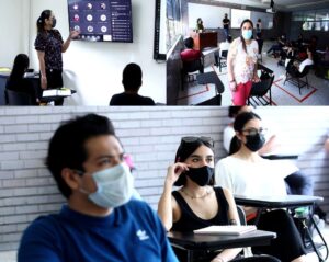 Para el flujo cuentan con protocolos de ingreso a las instalaciones, uso de cubrebocas, toma de temperatura, gel sanitizante, señalética de circulación y la adecuada ventilación. Las aulas híbridas cuentan con cámaras, proyectores, pizarras inteligentes y altavoces. La concurrencia presencial es menor al 30 por ciento del alumnado inscrito a cada curso.