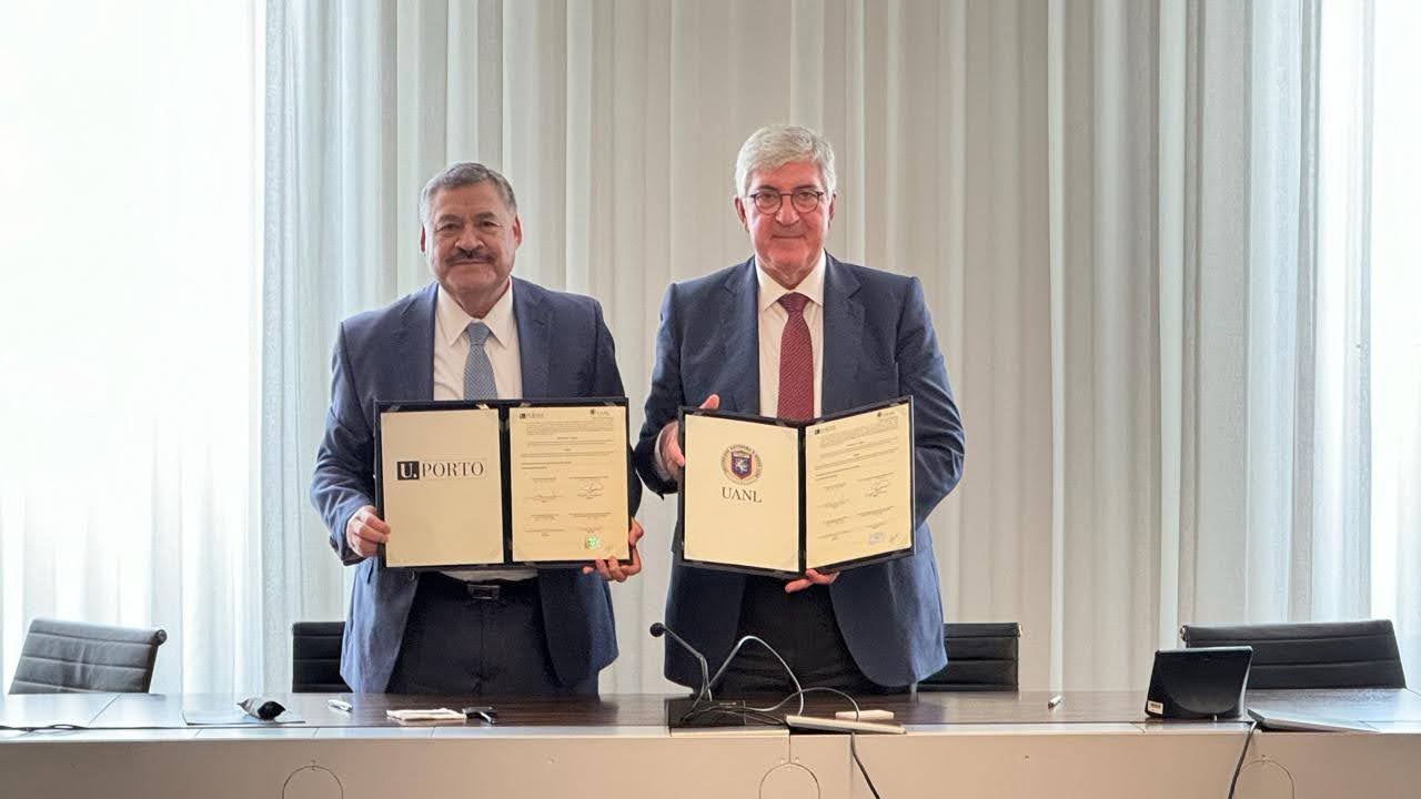 En un viaje de trabajo por Europa, el Rector de la Universidad Autónoma de Nuevo León, Santos Guzmán López, firmó convenios académicos con el Rector de la Universidad de Oporto, Antonio Manuel de Sousa.